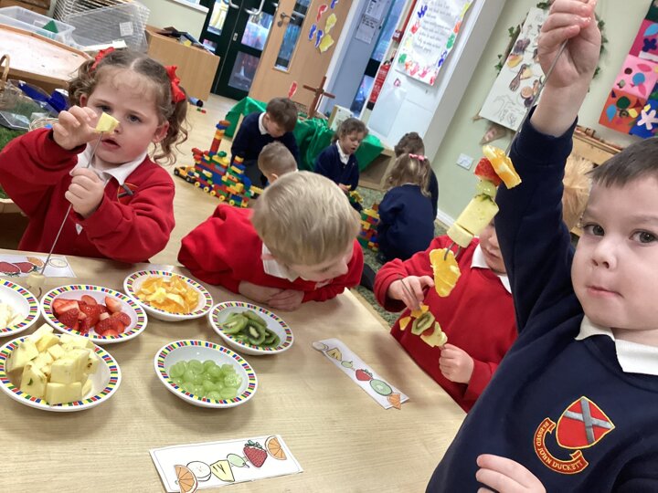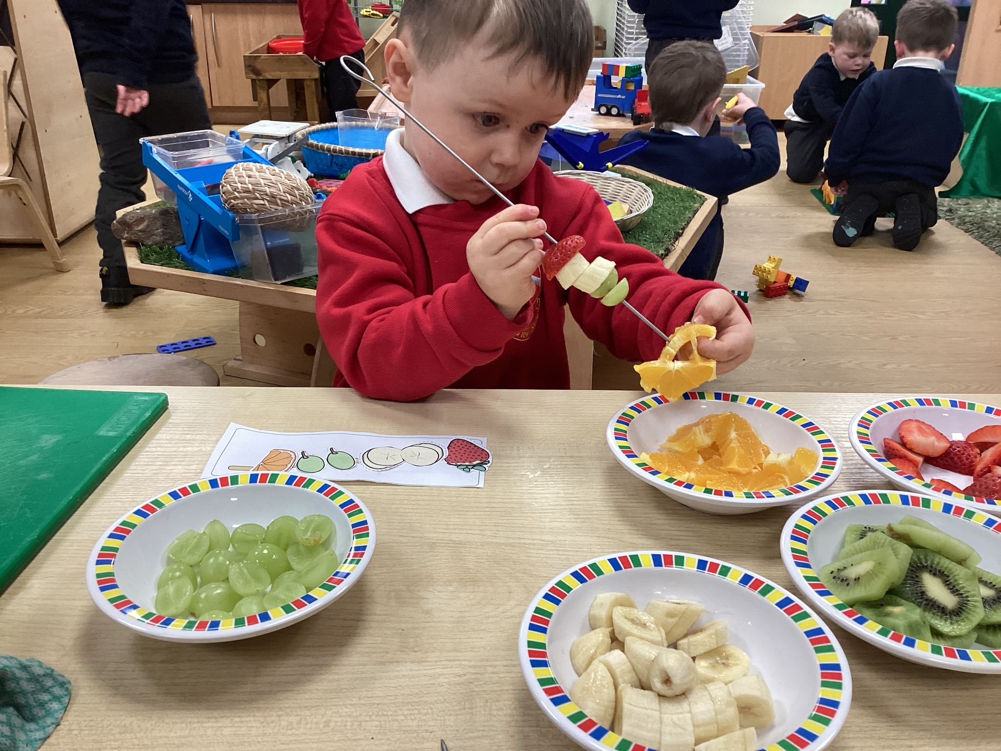 Inspired by Handa’s Surprise, the children also had the chance to try a selection of fruits featured in the story. They enjoyed preparing colourful fruit kebabs, tasting new flavours and learning more about where these fruits grow.